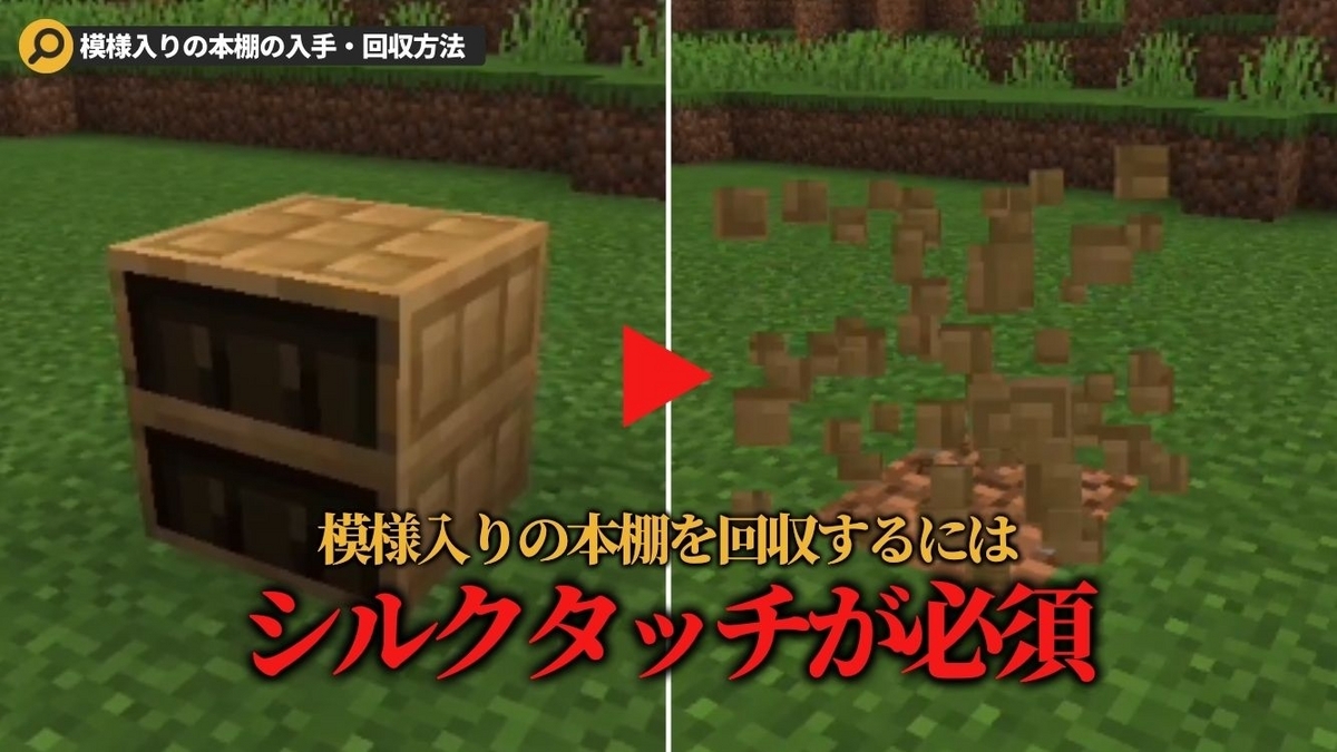 模様入りの本棚を回収するためには「シルクタッチ」のエンチャントを使用する必要があります。シルクタッチが付与されていないツールで破壊すると消えてしまいます。