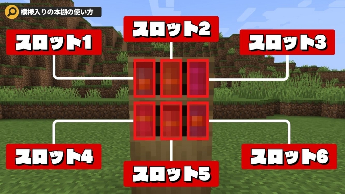模様入りの本棚は、板材を6個と木材のハーフブロックを3個使用することで、1個の模様入りの本棚をクラフトすることができます。