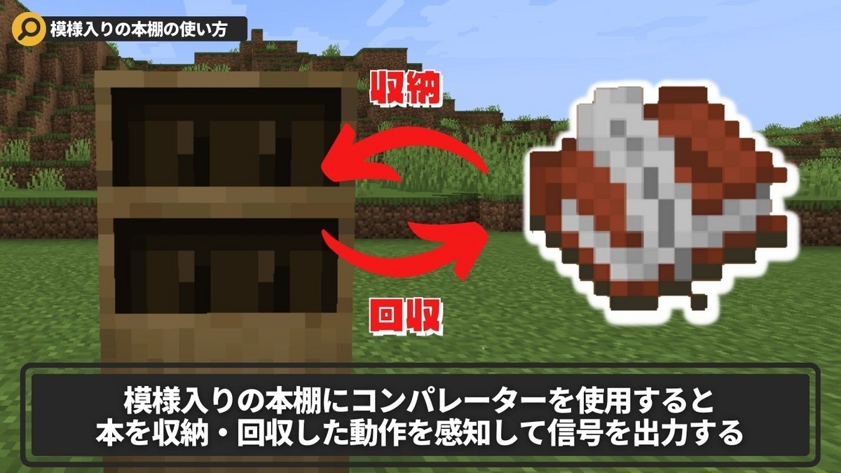 模様入りの本棚はコンパレーターを使用することで、収納・回収した動作を感知してレッドストーン信号を出力します。