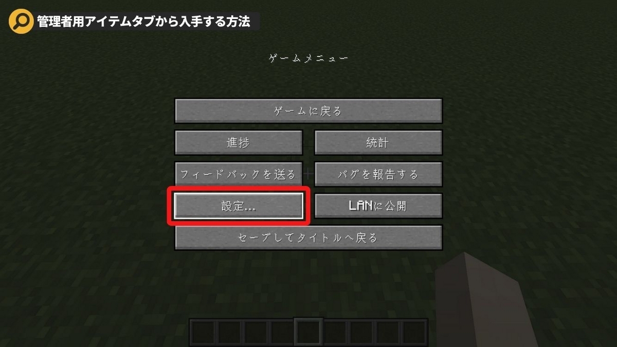 設定画面を閉じ、ゲーム画面に戻ってきたら「インベントリ」を開くと、インベントリタブの中に「管理者用アイテム」という新しいタブが追加されているはずです。
