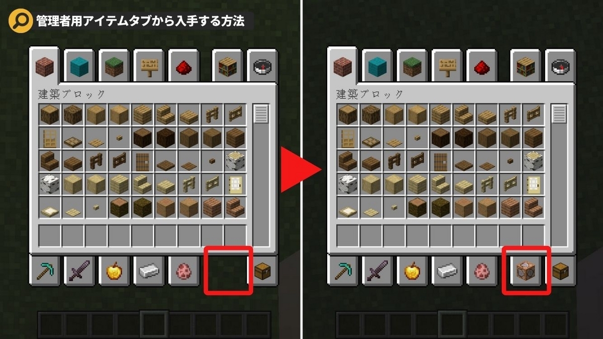 - 「管理者用アイテムタブ」や「コマンド」を用いることで入手することができる