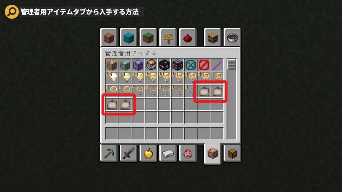 隠し絵画の入手方法は「管理者用アイテムタブ」から入手するものと「コマンドから召喚する」ものの2つがあります。