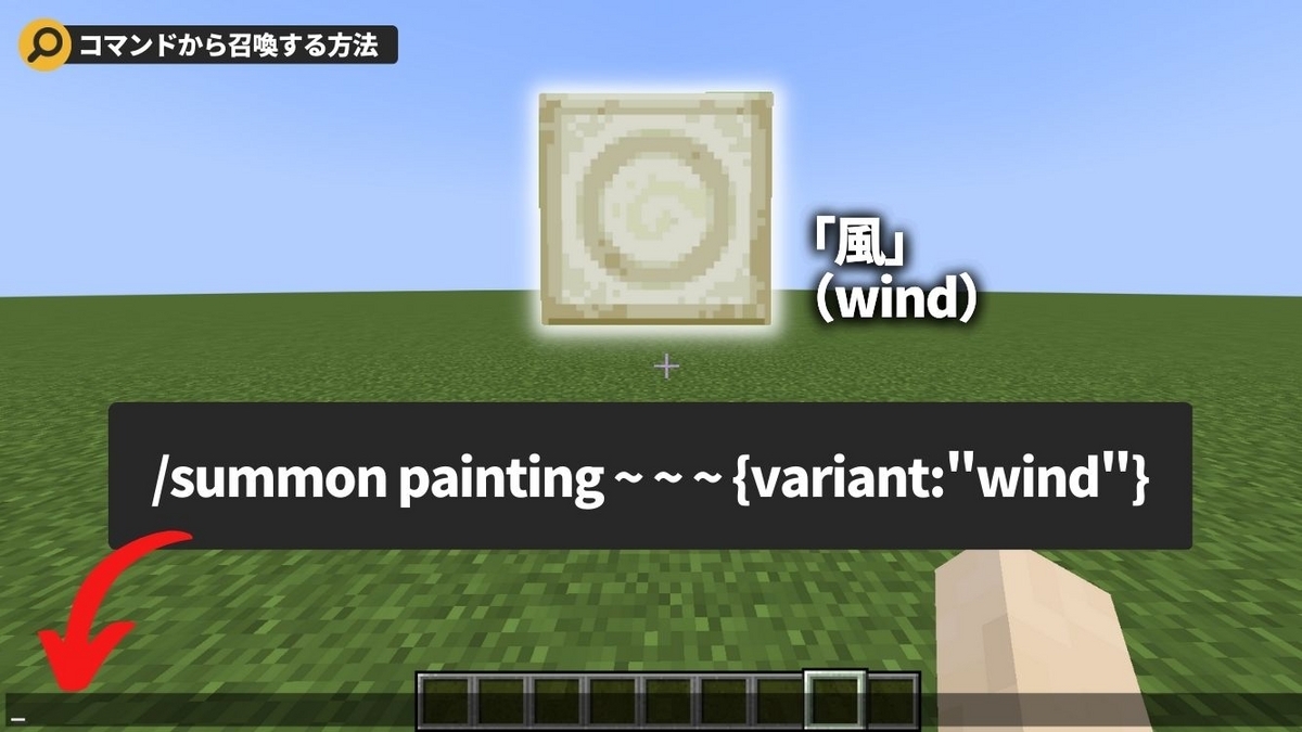 コマンド画面に【/summon painting ~ ~ ~ {variant:"wind"}】と入力することで、風の絵画が出現します。